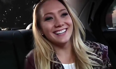 Busty, platinum-blonde cock sucker in black fishnets, Louise Lee is doing it with many horny guys